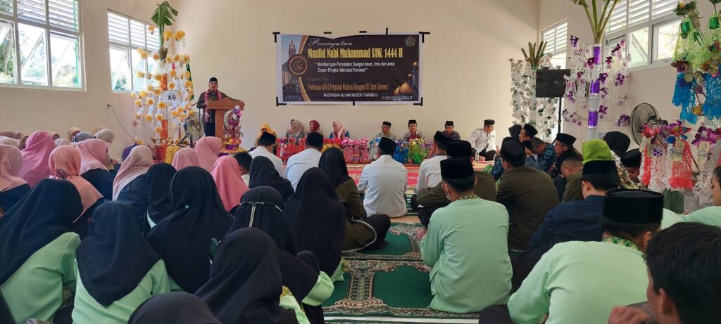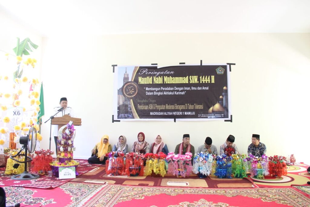HUMAS MAN 1 MAMUJU – Madrasah Aliyah Negeri (MAN) 1 Mamuju menggelar Peringatan Maulid Nabi Muhammad SAW, 17 Rabiul Akhir 1444 H di aula MAN 1 Mamuju, Jl Soekarno Hatta, Sabtu (12/11). Kegiatan Maulid ini sekaligus menjadi momen Pembinaan ASN dan Penguatan Meoderasi Beragama di Tahun Toleransi.