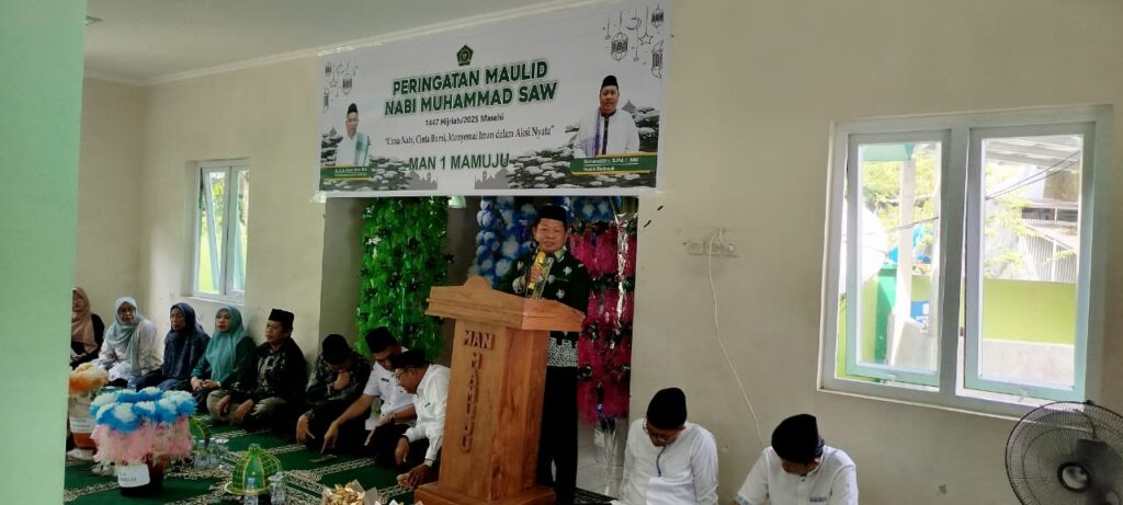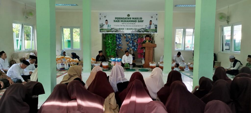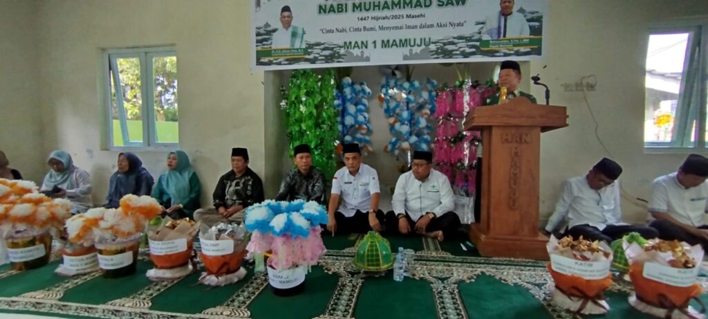 Mamuju, 24 Oktober 2025 – Madrasah Aliyah Negeri (MAN) 1 Mamuju menggelar peringatan Maulid Nabi Muhammad SAW dengan penuh khidmat dan semarak. Kegiatan yang mengusung tema “Cinta Nabi, Cinta Bumi, Menyemai Iman dalam Aksi Nyata” ini dihadiri oleh sejumlah pejabat penting dari Kementerian Agama Provinsi Sulawesi Barat dan Kabupaten Mamuju.